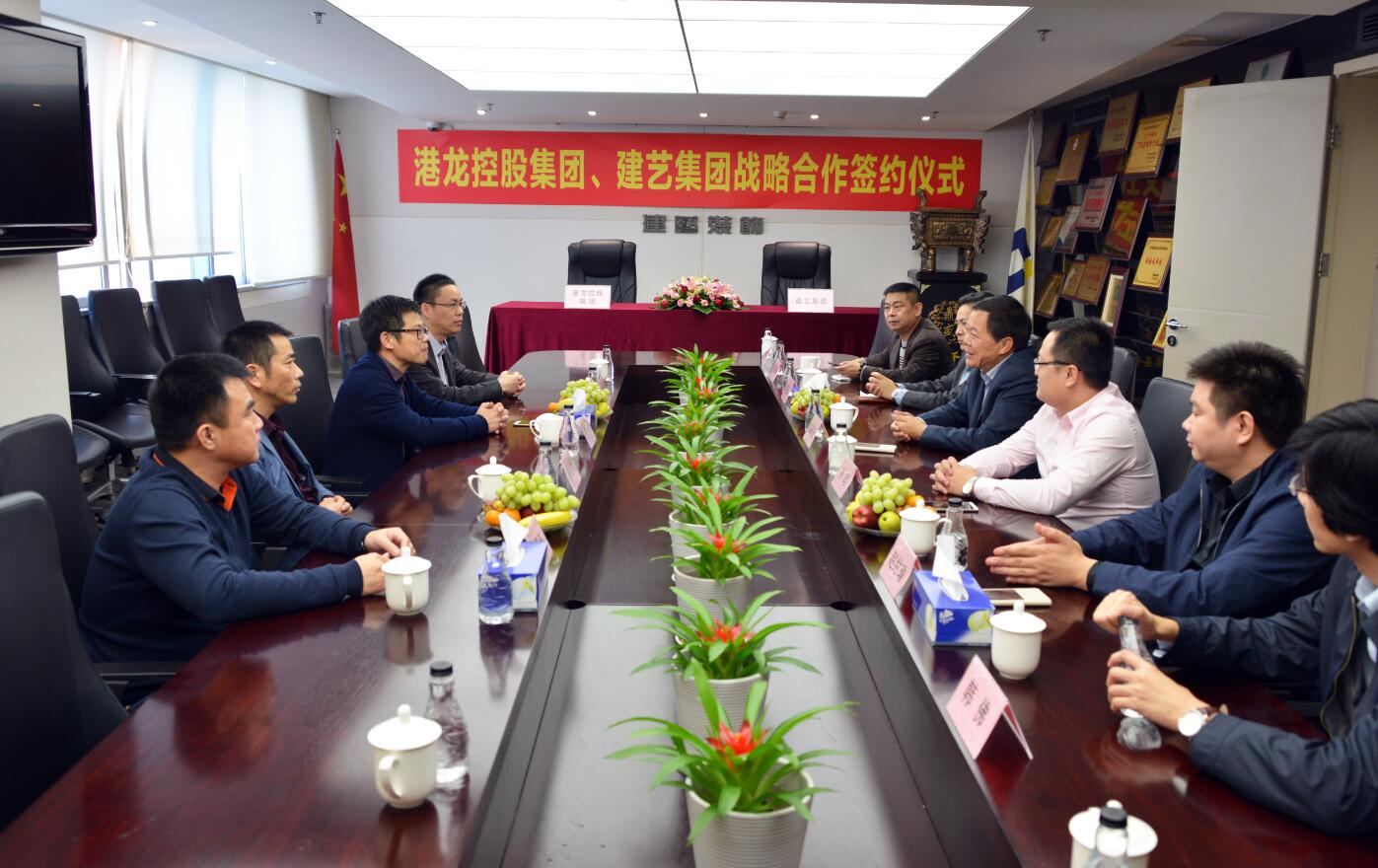 陈总裁表示:港龙控股集团作为以开发商业地产为主营的企业集团,每年都开发新的商业综合建筑,布局华中华南,并计划向全国进行布局开发,开发的项目都需要高标准、高品质的内外装饰。长期以来,港龙控股集团也一直计划寻找一家有实力的装饰企业来合作,建立稳定长期的合作伙伴关系。这次通过考察了解,特别是到建艺集团总部亲眼目睹到建艺集团的实力和创造的丰硕业绩,更加了解建艺集团的管理团队,这一切都让我们充分相信,建艺集团是一家名副其实的中国百强前八名的企业,是一家有规模、有实力的大型集团企业。希望能与建艺集团建立战略合作伙伴关系,建立互信、真诚、友好的合作关系,实现共赢。我相信建艺集团和港龙控股集团一定能够携手向前,推动企业向更新的目标发展。