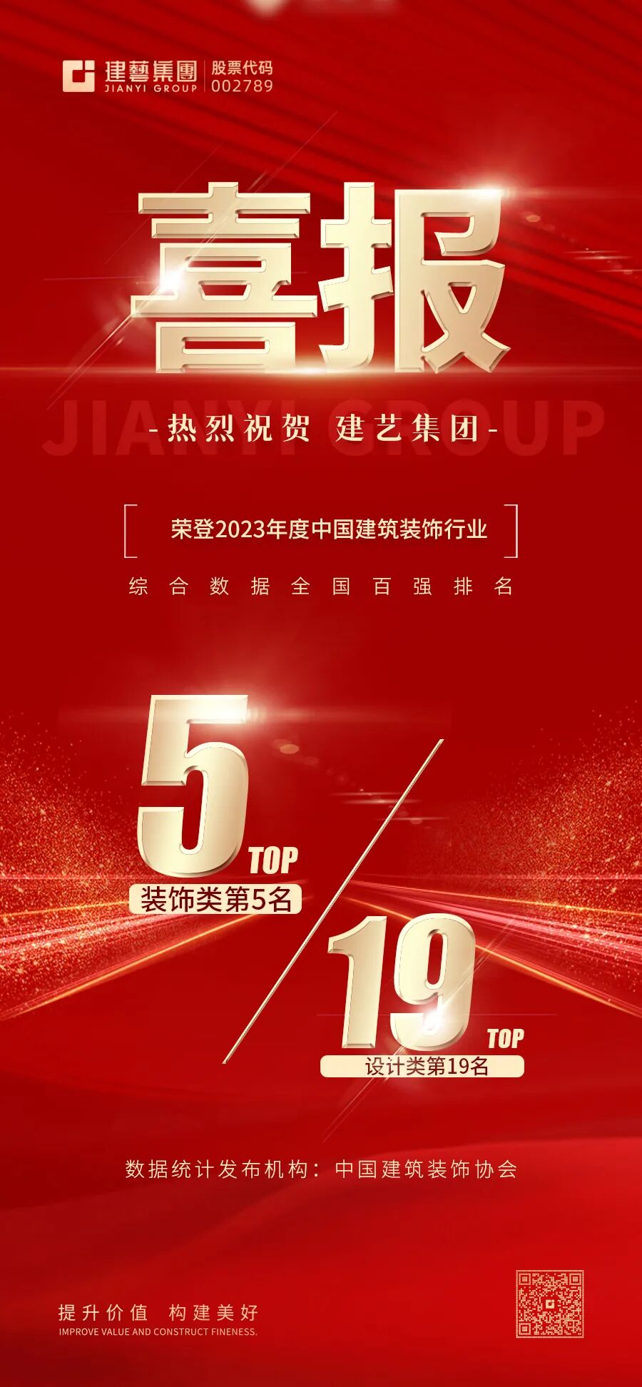 【重磅】建艺集团连续荣登中国建筑装饰行业综合百强榜装饰类第5名、设计类第19名,荣获三项“中国建筑工程装饰奖”