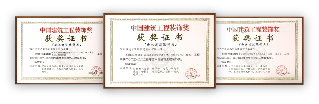 本次由建艺集团承建的“滨海廊桥工程装饰工程标段2(F地块-H地块)项目、深圳大学西丽校区建设工程(二期) 项目装修装饰工程 VI 标段、深圳湾实验室过渡场地二期装修工程(二标段)”三个项目荣获2023~2024年度“中国建筑工程装饰奖”。