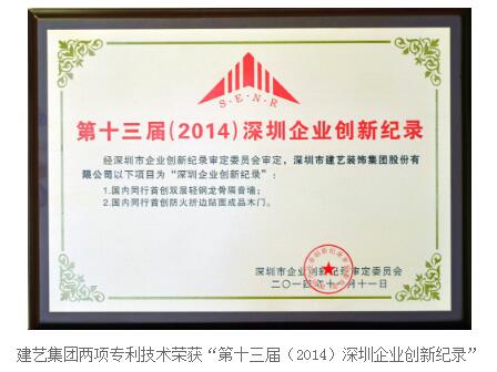 日前,建艺集团在深圳工业总会及深圳市企业创新记录组织委员会共同举办的“第十三届深圳企业创新记录”评选中,一举夺得“自主创新企业金奖”荣誉,为企业在科技创新领域的发展增添新辉。另外,建艺集团两项创新专利技术——“双层轻钢龙骨隔音墙”及“防火折边贴面成品木门”更是荣获“第十三届(2014)深圳企业创新记录”奖,经审定委员会审定,建艺集团的这两项技术均为国内同行首创。