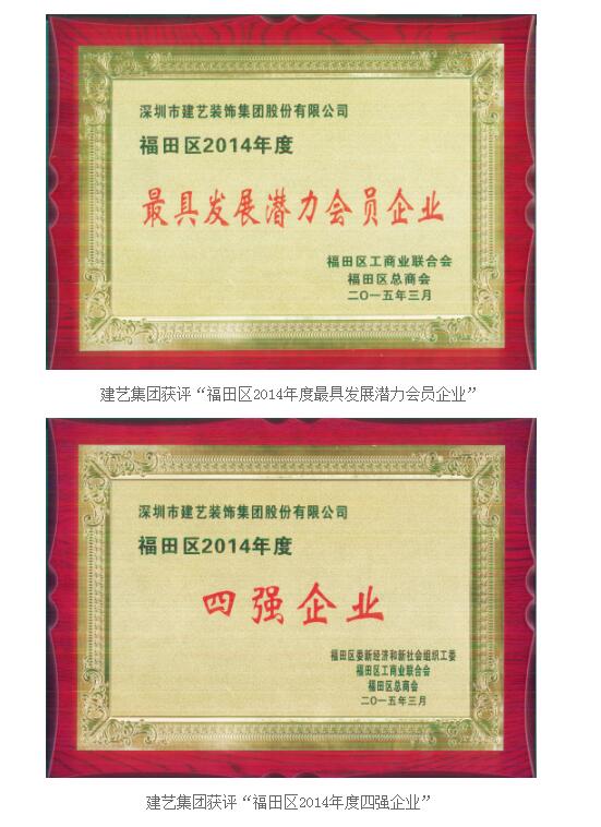 建艺集团喜获福田区工商联(总商会)“2014年度最具发展潜力会员企业”、“2014年度四强企业”荣誉