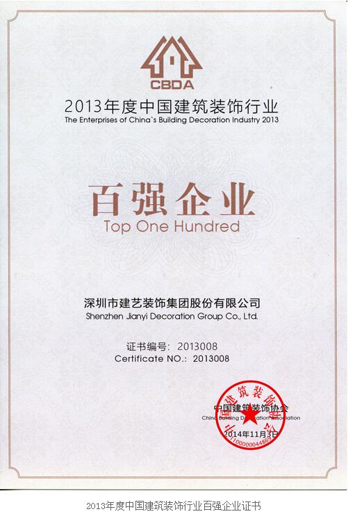 建艺集团荣获“2013年度中国建筑装饰行业百强企业”第八名