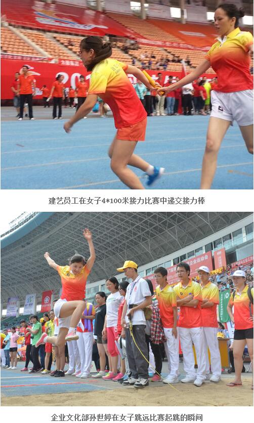 在运动会开幕式之后的竞赛及趣味项目比拼环节,建艺人继承了方阵展示所表现出的良好团队协作素质,无论是竞争激烈的女子800米赛跑,还是挑战爆发力的男、女跳远,亦或是全场关注的女子4*100米接力赛,参赛的选手与场下的啦啦队融为了一体——赛道边,啦啦队的成员高举企业旗帜,为参加竞赛的运动员加油助威;而在看台上,建艺人更是自发地组织起来高声呐喊,巨幅的企业旗帜更是成为了当天最为醒目的公司看台景观。而在下午进行的趣味项目比拼环节中,建艺团队充分发挥出了协作的优势,凭借高效的配合与精湛的技艺,在“袋鼠运瓜”及“趣味接力”项目中取得了好成绩,“趣味接力”项目更是获得了第二名,捧得了团体优胜奖杯,为当天的竞赛划上了圆满的句号。
