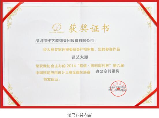 继7月在中国建筑装饰协会及中国建筑装饰与照明设计师联盟共同主办的“2014(第六届)‘照明周刊杯’中国照明应用设计大赛南宁赛区颁奖典礼”上斩获南宁赛区一等奖后,建艺集团的参赛作品《建艺大厦》在近日再次凭借一流的设计思维与应用理念,获得了2014“昭信·照明周刊杯”第六届中国照明应用设计大赛全国总决赛办公空间银奖。