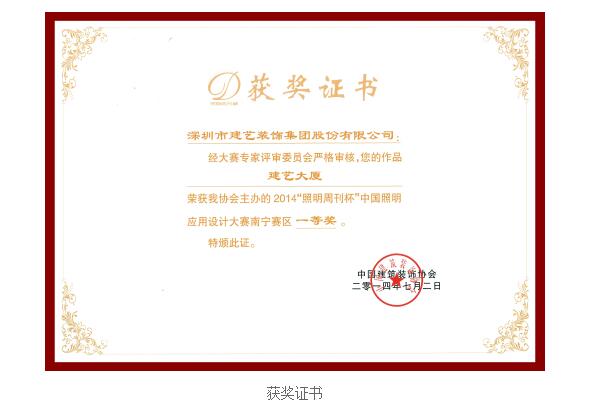 7月2日,由中国建筑装饰协会及中国建筑装饰与照明设计师联盟共同主办的“2014(第六届)‘照明周刊杯’中国照明应用设计大赛南宁赛区颁奖典礼”在广西锦华大酒店隆重举行。建艺集团的参赛作品《建艺大厦》凭借着一流的设计思维与应用理念,得到了评选专家的一致青睐,最终拔得头筹,荣获南宁赛区一等奖,成为本次颁奖典礼上最“耀眼”的照明应用设计优秀典范作品。