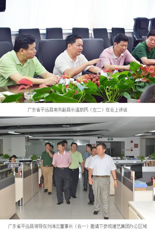 6月19日,广东省平远县常务副县长温助民一行6名领导到访建艺集团。集团董事长刘海云携部分集团高管对领导们的莅临表示热烈欢迎,并在集团会议室与到访领导进行了亲切会谈。