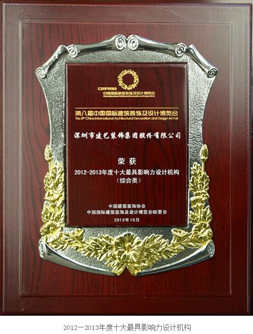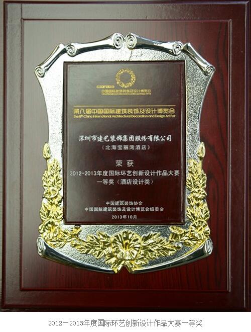 经过众多国内外设计专家的共同探讨,作品评审,建艺集团凭借着强劲实力在本次“设博会”上斩获两大奖项,建艺集团荣获2012-2013年度十大最具影响力设计机构(综合类);由设计院郭杰院长主持设计的北海宝丽湾酒店荣获2012-2013年度国际环艺创新设计作品大赛一等奖(酒店设计类)。