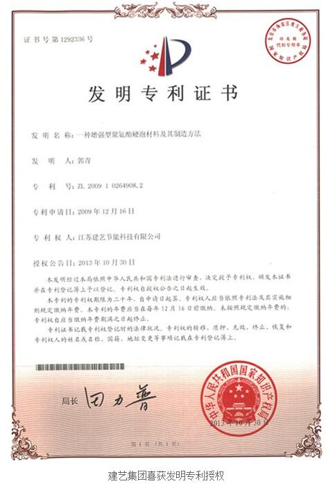 近日,建艺集团申报的发明专利《一种增强型聚氨酯硬泡材料及其制造方法》(专利号:ZL 200910264908.2)获得国家知识产权局的授权。该专利由建艺集团下属企业——江苏建艺节能科技有限公司主持研发,是一种新型的建筑外墙保温材料。通过多项工程的实际应用证明,该专利材料在改善产品性能、降低制造成本以及节能环保等方面均有显著效果。
