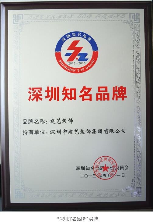 深圳知名品牌作为打造深圳质量的主力军,诸多企业成为国内甚至国际上的排头兵。建艺集团“建艺装饰”品牌2006年被评选为“深圳知名品牌”,凭借着卓越的成绩一直保持着该项殊荣。建艺集团自成立以来,秉承以德为先,诚信为本,构筑精品为目标的宗旨,一直快速发展,在建筑装饰领域树立了良好的口碑与形象,为深圳的经济社会发展做出了突出贡献。