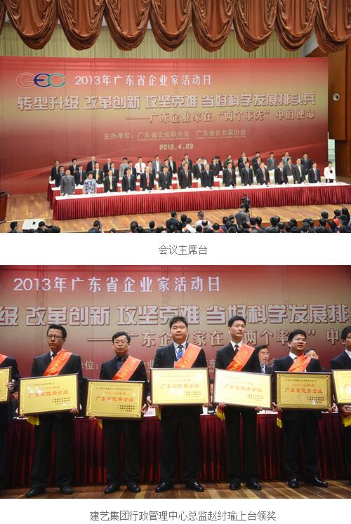 4月23日上午,由广东省企业联合会、企业家协会主办的“2013年广东省企业家活动日”在广州白云国际会议中心举行。中共中央政治局委员、广东省委书记胡春华亲切接见受表彰的2012年度广东省优秀企业、优秀企业家、最佳诚信企业、创建学习型企业十佳单位代表,建艺集团行政管理中心总监赵纣瑜参加了此次会议。在表彰大会上,建艺集团分别荣获“广东省优秀企业”和“广东省诚信示范企业”两大殊荣。