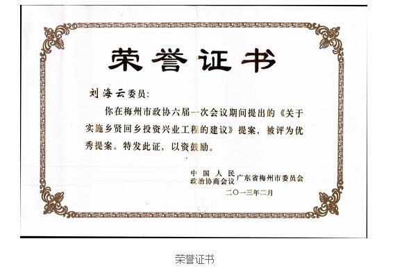会议期间,刘海云董事长提出了《关于实施乡贤回乡投资兴业工程的建议》提案。该提案对乡贤回乡投资兴业工程提出了多个操作性强的意见,被中国人民政治协商会议广东省梅州市委员会评为优秀提案。