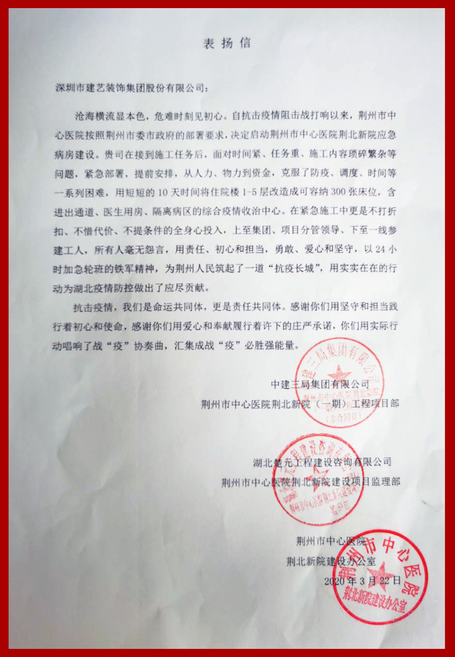 回溯难忘的2月,面对严峻的抗疫形势,接到任务的建艺集团荆州市中心医院荆北新院应急病房建设团队,排除了人力、物力、防疫、调度、时间等一系列困难,仅用时10天,成功将住院楼1-5层改造成可容纳300张床位,含进出通道、医生用房、隔离病区的综合疫情中心,有力支援了荆州的疫情防控工作。