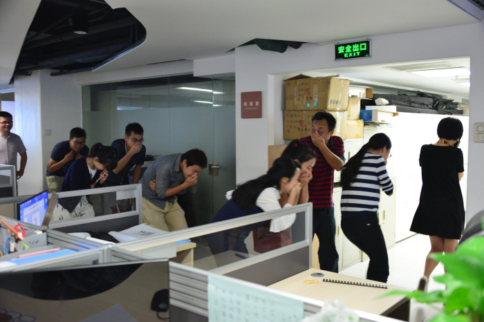 建艺集团员工在烟雾中寻找逃生通道