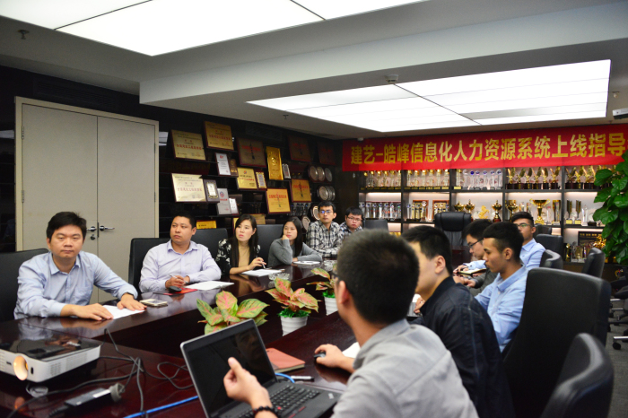 11月23日下午,建艺集团信息化系统管理项目——人力资源系统上线指导会在集团总部会议室举行。本次指导会由集团副总裁赵纣瑜、人力资源部总经理王久奎、信息技术部副总经理王彬等领导带领人力资源部和信息技术部员工一同参加。指导会上,深圳市皓峰通讯技术有限公司实施经理刘彬担任主讲,并就信息化人力资源系统中招聘、培训、员工关系、考勤管理、绩效考核等模块展开详细的操作指导和系统优化讨论。