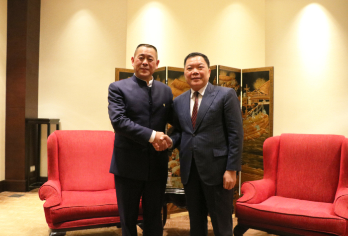 建艺集团董事长兼总裁刘海云(右)与天基权集团董事长释延豹合影