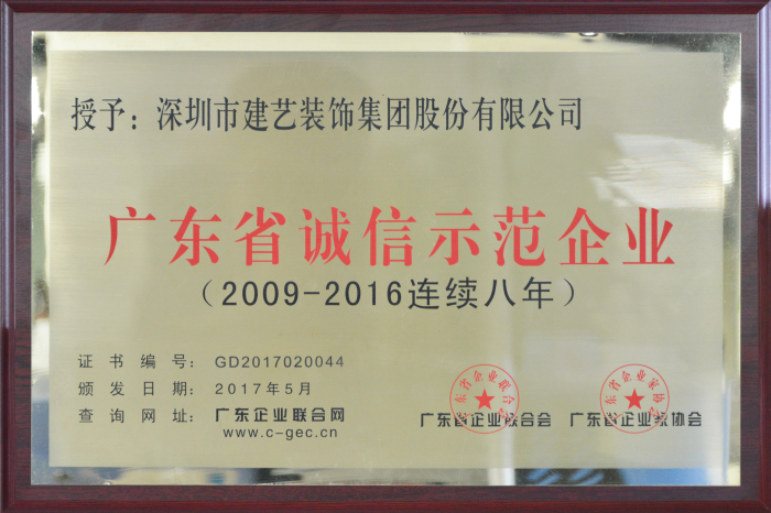 作为中国建筑装饰行业百强企业前十名企业,建艺集团历来注重品牌与诚信建设。多年来,以专业管理、诚信经营、品牌塑造为主旨,建艺人在建筑装饰领域锐意进取、勇攀新高,用实实在在的诚信经营口碑及强大的品牌影响力,为社会贡献了一大批装饰装修工程精品,并尽自身能力不断推动广东社会经济发展。5月10日,在广东省企业联合会/广东省企业家协会主办的“第23届广东省企业家活动日”大会上,建艺集团凭借出众的诚信管理体系及卓越的行业发展表率,再次蝉联“广东省优秀企业(2016年度)”及“广东省诚信示范企业(2009-2016连续八年)”。