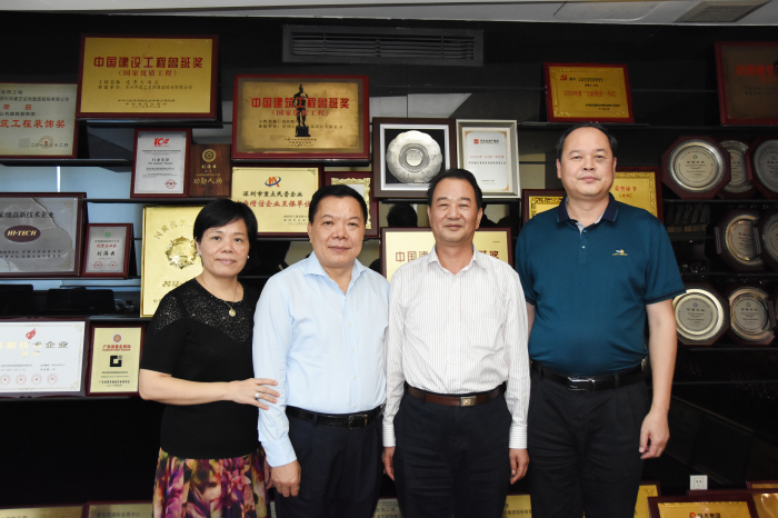 广东省梅州市政协主席陈建青(右二)、副主席李忠良(右一)在建艺荣誉墙前同刘海云董事长及颜如珍副总裁合影