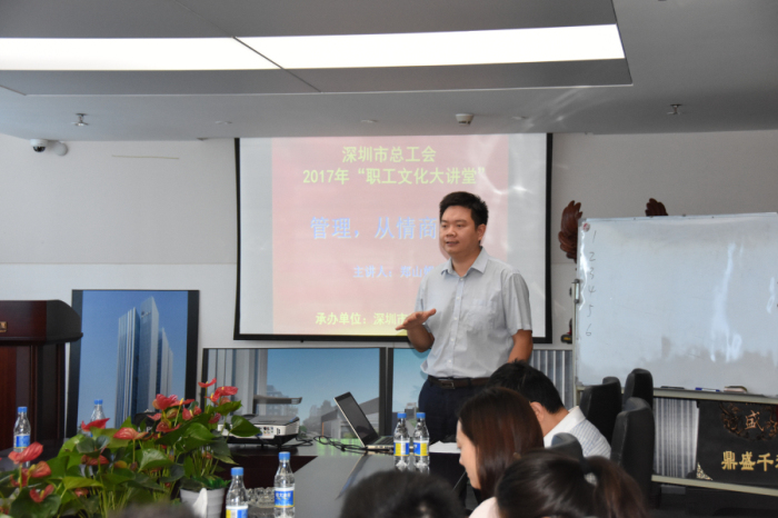 为不断提高员工的自我管理能力,进一步提升员工工作效率和企业整体管理水平,增强企业团队的凝聚力和竞争力,8月15日下午,由集团人力资源部主办的“2017年建艺学院‘职工文化大讲堂’培训”在19楼会议室如期举行。本次培训的主题为“管理,从情商开始”,由深圳市总工会的政府质量奖评审专家、卓越绩效(中国)辅导专家郑山姆讲师担任主讲,集团副总裁赵纣瑜担任培训开场嘉宾。