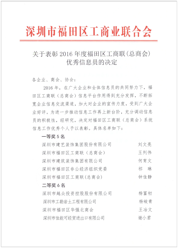 2016年度福田区工商联(总商会)优秀信息员表彰揭晓 建艺集团蝉联第一名