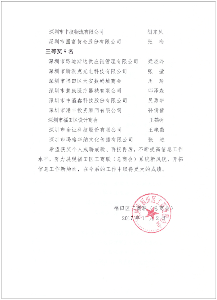 2016年度福田区工商联(总商会)优秀信息员表彰文件