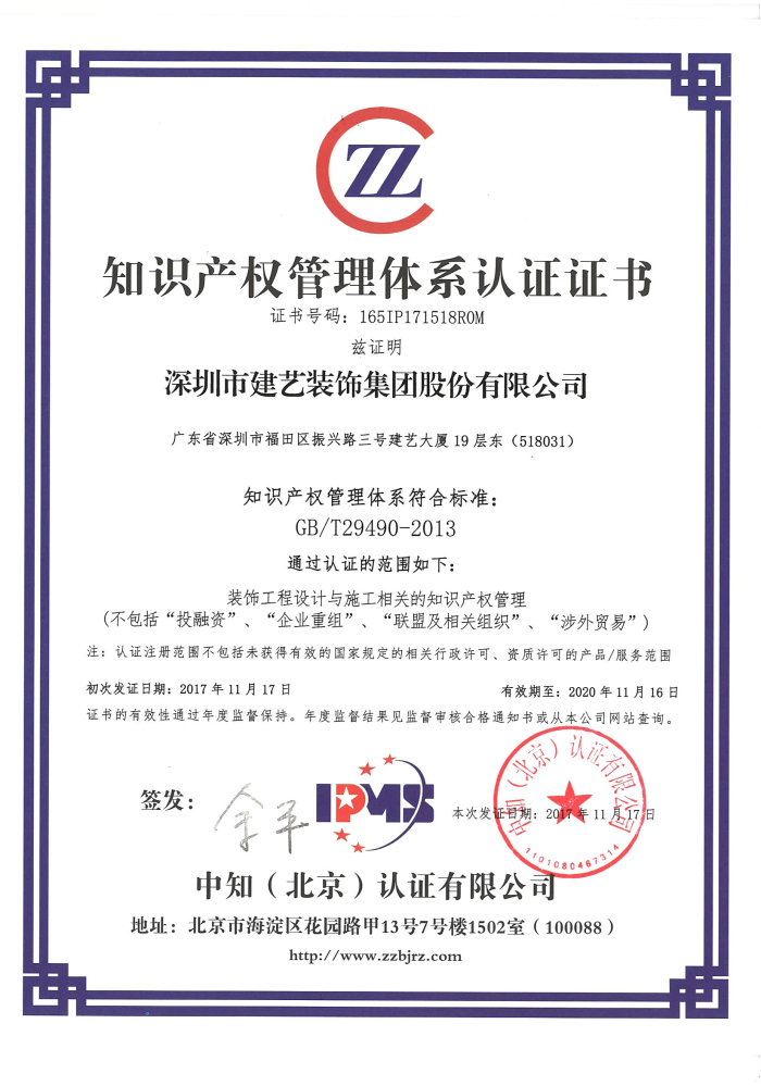 鉴于此,建艺集团于2016年年底着手知识产权管理体系引用与推行的准备工作,2017年3月开始在集团各管理职能部门贯彻实施,并于2017年11月17日通过中知(北京)认证有限公司首次认证。
