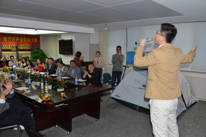 建艺集团副总裁赵纣瑜、营销管理中心总监许凯华、成控评估中心总监涂国发作为评委出席大赛,并在大赛期间倾情献唱,为选手助威。大赛由采购管理部吴建强主持,来自集团各中心的近二十名选手在三个多小时的比赛时间内,进行了包括红歌曲目在内的多曲种激烈演唱角逐。最终,来自成控评估中心的张桃凤凭借动人的嗓音及优美的曲风摘得桂冠,荣获第一名;人力资源部龙俏君及营销管理中心张志源获得第二名;工程资料部罗源、人力资源部易菲菲、企业文化部杨柱获得第三名;其他歌手则获得“优秀歌手奖”。