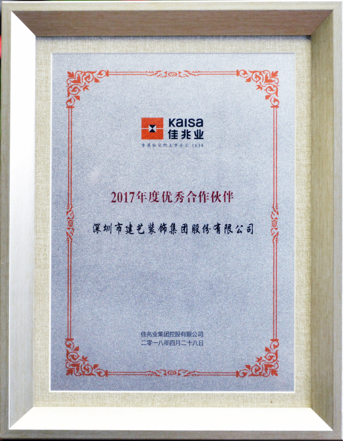 开创新时代的良好发展格局,离不开合作伙伴的匠心精神。本着公平公正的原则,佳兆业集团对所有合作伙伴进行严格评估,峰会现场颁发了“2017年度优秀合作伙伴”等五大奖项,以表彰2017年度在品质、设计、服务、贡献、长期合作等方面做出杰出贡献的合作伙伴及优秀个人。建艺集团凭借卓越的合作表现及长期以来对品质的无懈追求,荣获“2017年度优秀合作伙伴”奖。