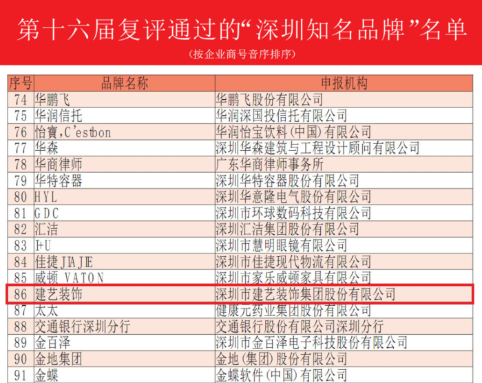 日前,深圳知名品牌评价委员会公布了第十六届“深圳知名品牌”复审通过企业名单,刚刚获评为“深圳老字号”的建艺集团,其所持有的“建艺装饰”品牌顺利通过复审,第五次荣膺“深圳知名品牌”称号。