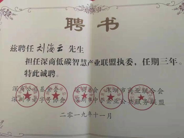 值得一提的是,会上,为深入实施深商企业家自治办会,探索会员服务从大综合向产业化、专业化转变新途径,深商会携手相关行业领军企业家,开启了深商产业联盟服务体系的建设。本次理事会,深商投融资、专利运营、高端制造、品牌发展、产业园、文化时尚、生命健康、低碳智慧、AI 智能机器人、新材料等十大深商产业联盟分别举行授旗颁证仪式,多名行业知名企业家分别出任相关产业联盟主席。作为深圳优秀企业家代表、深圳市商业联合会副会长——建艺集团、建艺控股董事会主席刘海云受聘担任深商低碳智慧产业联盟执委。