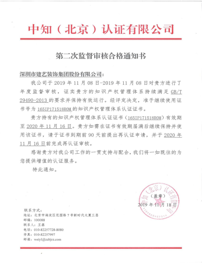 日前,建艺集团顺利通过了由中知(北京)认证有限公司审核组的知识产权管理体系年审,并连续两年度获得知识产权管理体系年审合格证书。