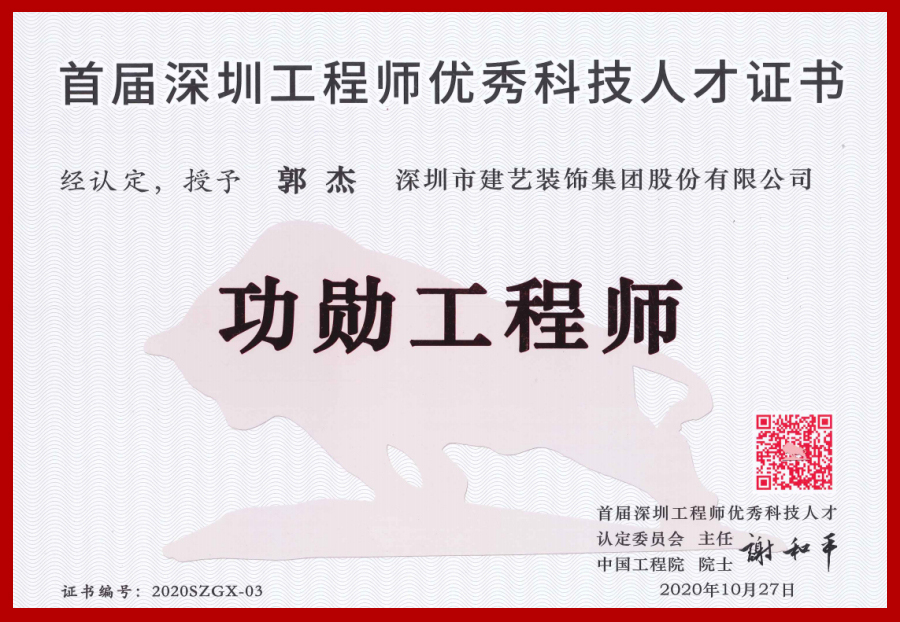 建艺集团设计研究院郭杰院长从事建筑装饰设计数十载,擅长以独到个性的美学思维与对建筑美学的深刻定义,将艺术与生活、光影与空间、设计与建筑、环保与未来充分融合,打造具有国际视野与可持续形态的装饰设计典范,并强调设计的艺术性与可持续性。作为正高级工程师,能够在首届深圳工程师优秀科技人才评定中获得“功勋工程师”殊荣,充分彰显了郭杰院长在中国建筑装饰工程、设计领域的卓绝实力,其对中国建筑装饰设计行业的发展与进步起到了突出的推动与促进作用,是当之无愧的“设计大师”!