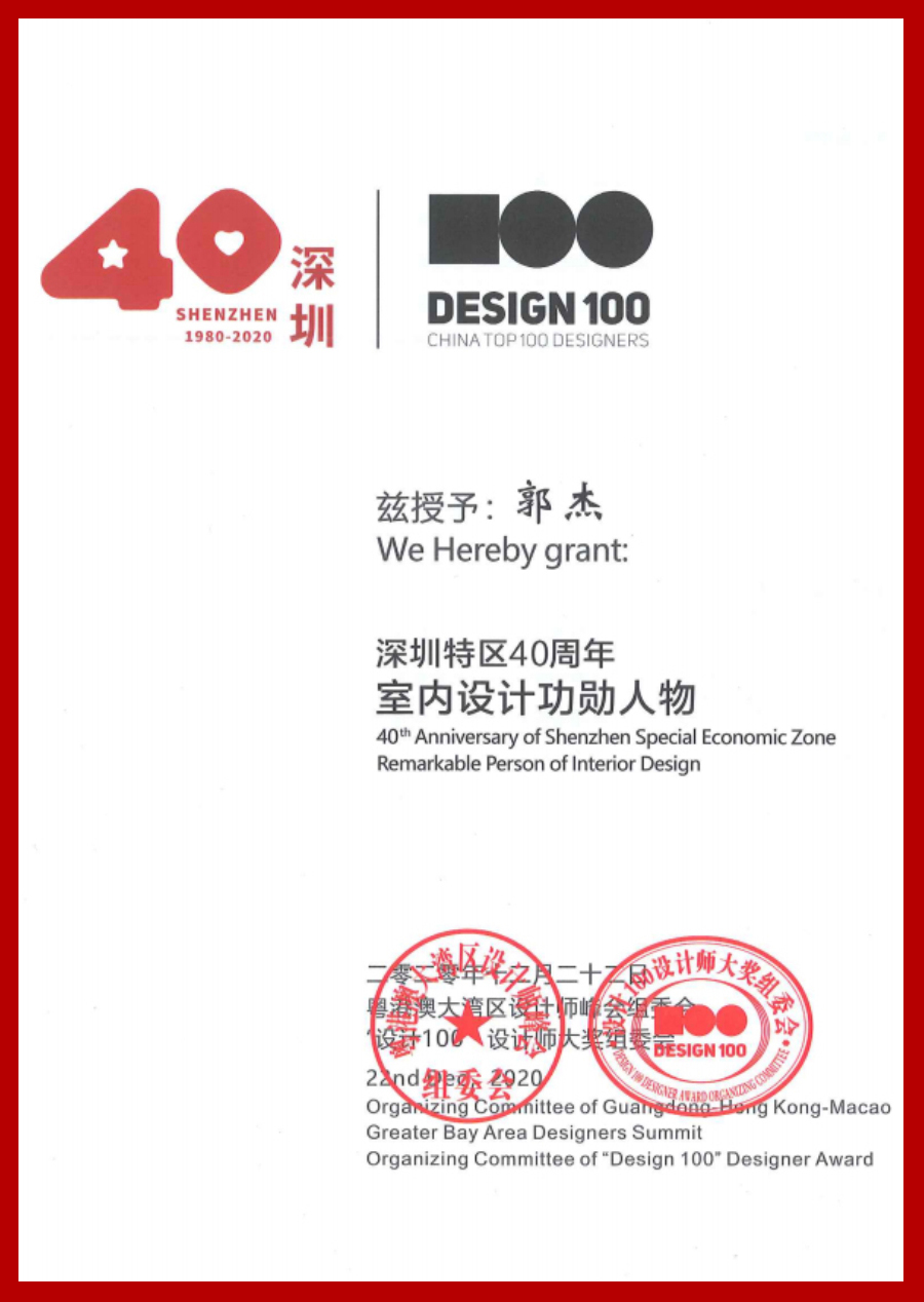 此次获得“‘设计100’——深圳特区40周年:室内设计功勋人物”及“首届深圳工程师优秀科技人才——功勋工程师”双料殊荣,不仅是对郭杰院长及建艺集团设计研究院长期以来推动、促进、影响建筑装饰设计领域蓬勃发展的认可与表彰,更是对“建艺设计”未来继续高品质输出,打造“深圳质量”继续引领行业不断前行的激励与期盼。放眼未来,“建艺设计”将继续在郭杰院长的领导下,秉承“匠心”,为“深圳品质”助力打造“美丽中国”之愿景而持续奋斗;不断努力,为深圳“双区”建设贡献力量!