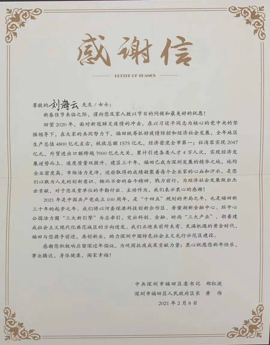 来自福田区委、区政府的感谢信