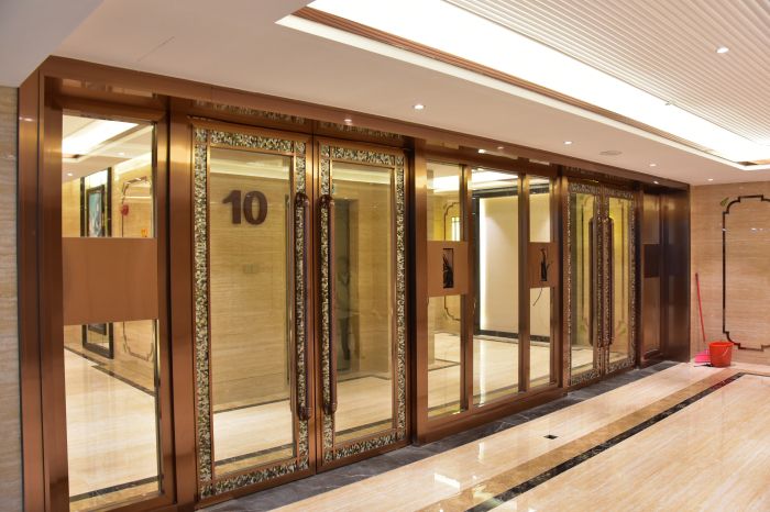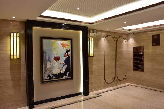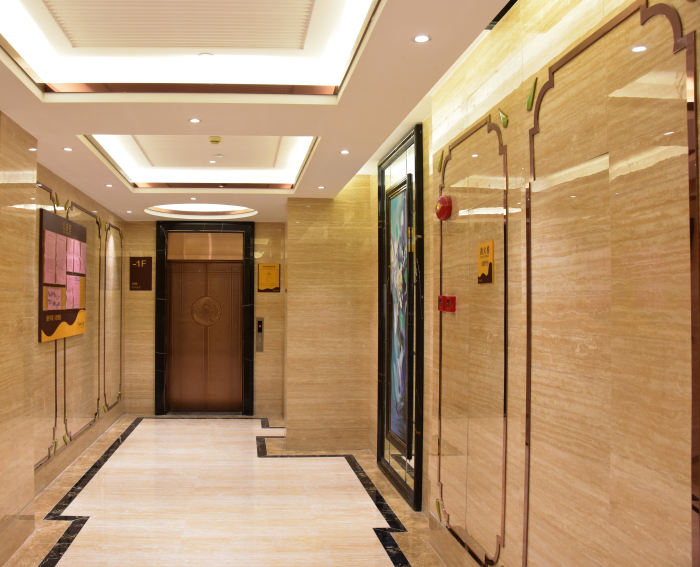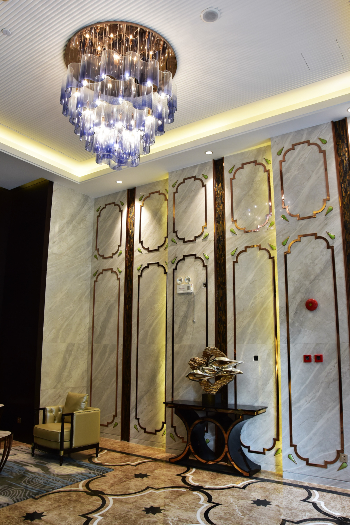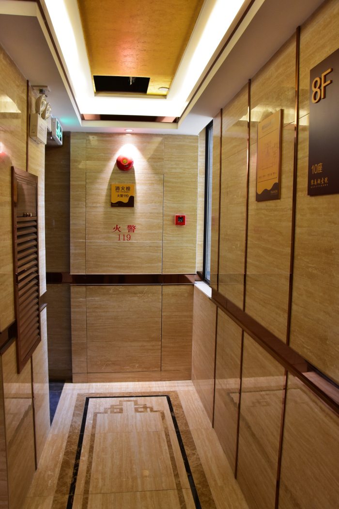 即便是地下入户大堂和标准层电梯厅,设计上也极其讲究,力求与首层大堂设计相呼应。地下入户大堂墙地面全部采用仿大理石瓷砖,墙面同样镶嵌玫瑰金镜面不锈钢装饰条配以蓝宝石点缀,地面采用浅啡网及阿富汉黑金花瓷砖波打线,视觉效果强烈,线条感十足。标准层电梯厅墙面为大理石瓷砖搭配玫瑰金不锈钢腰线,地面为大理石瓷砖拼花,天花则采用金箔饰面做旧工艺,整体交相辉映、不失尊贵。