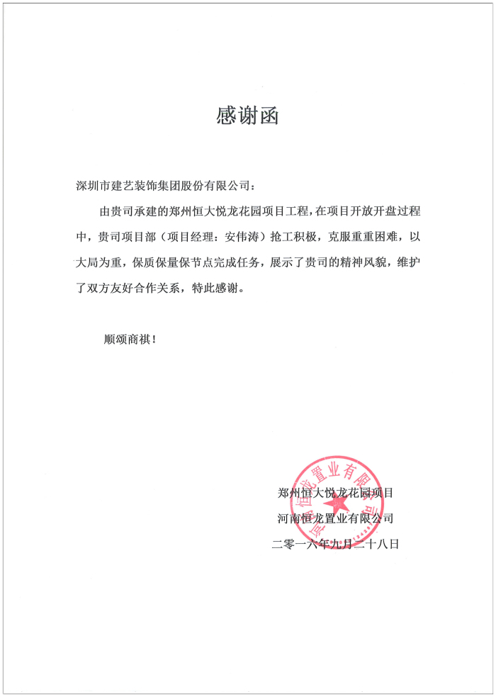 建艺集团郑州恒大悦龙花园项目部获表彰