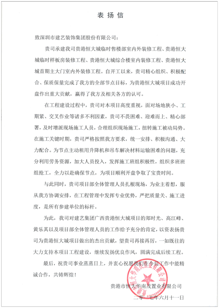 携手共进,争创辉煌——建艺集团广西贵港恒大城项目部荣获表彰