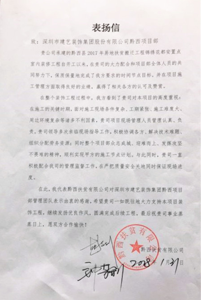 近日,黔西扶贫有限公司特向我司颁发“优秀企业单位”锦旗及表扬信以致感谢,并对建艺集团项目部全体人员提出表扬!