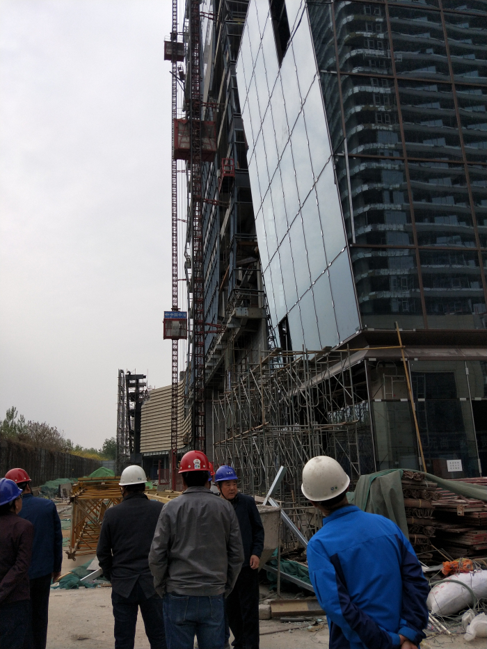 考察团一行领导查看我司施工的斜面玻璃幕墙效果