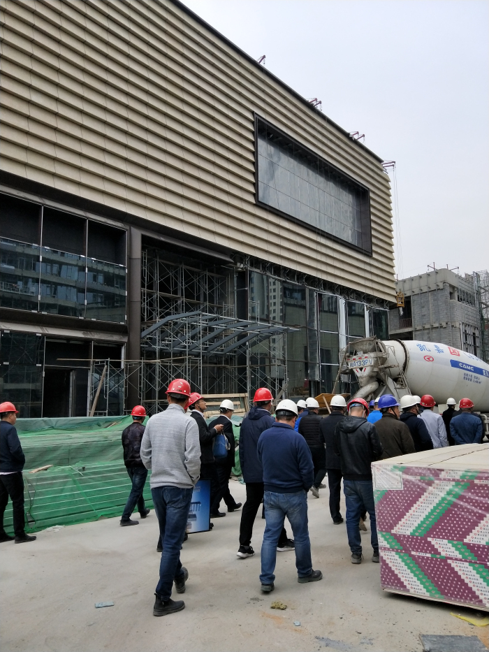 丁总一行在建艺集团等项目工程人员的陪同下,详细了解了项目整体施工情况,并对项目幕墙、样板区等区域的实际装修进展情况进行了考察。期间,丁总现场听取工程人员汇报,项目人员向丁总展示并介绍了我司施工技术亮点和项目部分施工效果。