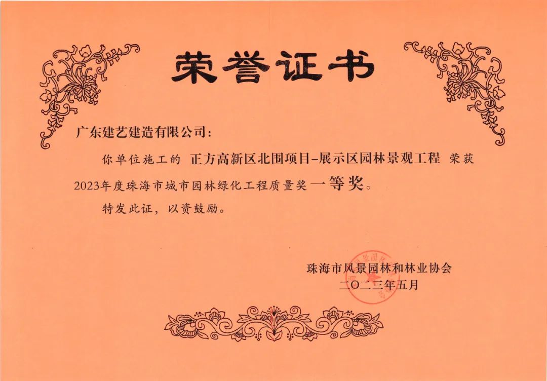 近日,由珠海市风景园林和林业协会主办的珠海市城市园林绿化工程质量奖评选活动落下帷幕,深圳市建艺装饰集团股份有限公司旗下广东建艺建造有限公司承建的正方高新区北围项目-展示区园林景观工程荣获“2023年度珠海市城市园林绿化工程质量奖”一等奖。