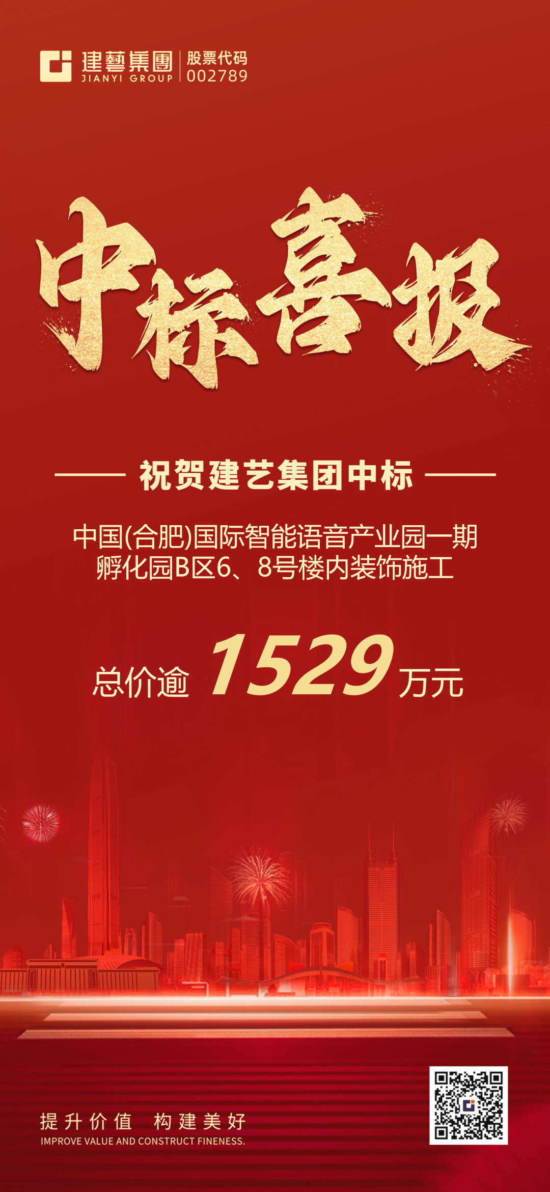 近日,建艺集团喜报频传,再次中标两项重大项目中国(合肥)国际智能语音产业园一期孵化园装饰施工项目、方达成大厦办公物业装修改造施工项目,总价逾9486万元。