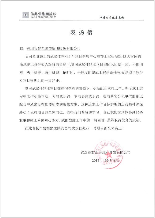 一封关于建艺集团武汉佳兆业一号项目部的表扬信