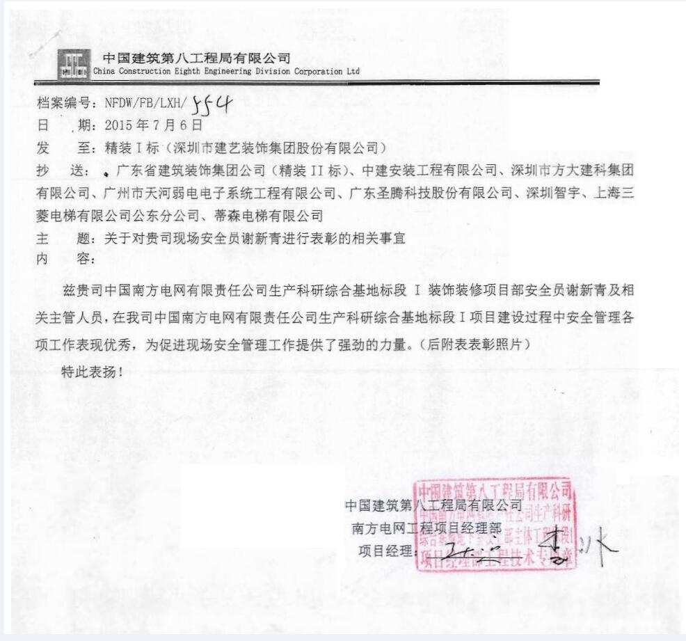 建艺集团安全员谢新青获中建八局南方电网项目部通报表彰