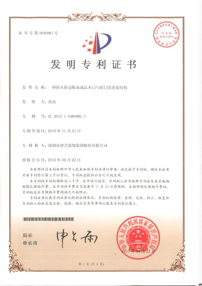 近日,由建艺集团自主研发的“一种防火折边贴面成品木门与暗门套连接结构”发明专利获得了国家知识产权局的授权,其专利号为ZL201210480882.7。