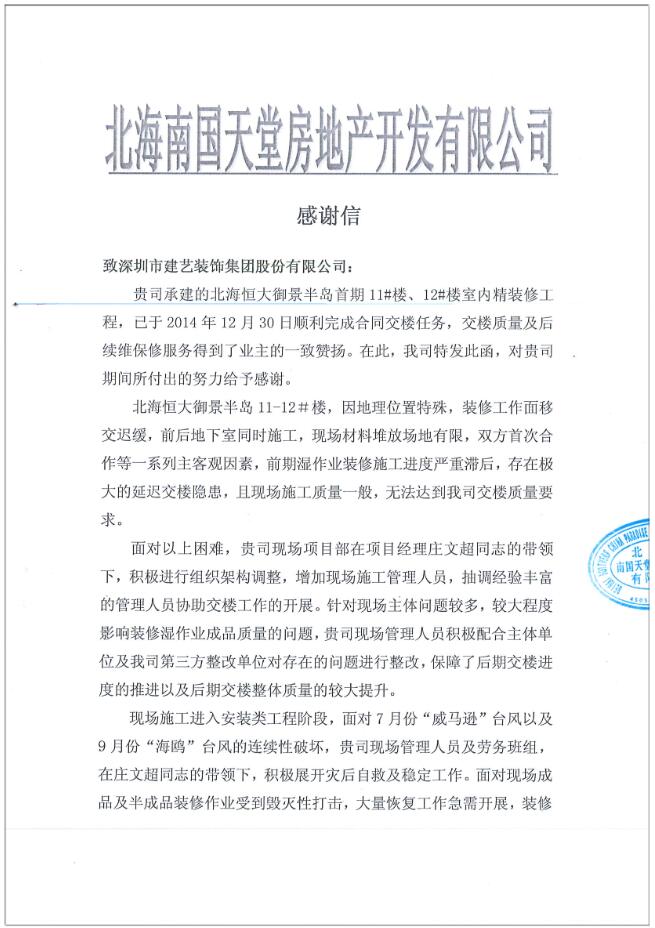 北海恒大御景半岛首期11、12#楼室内精装修工程表扬信