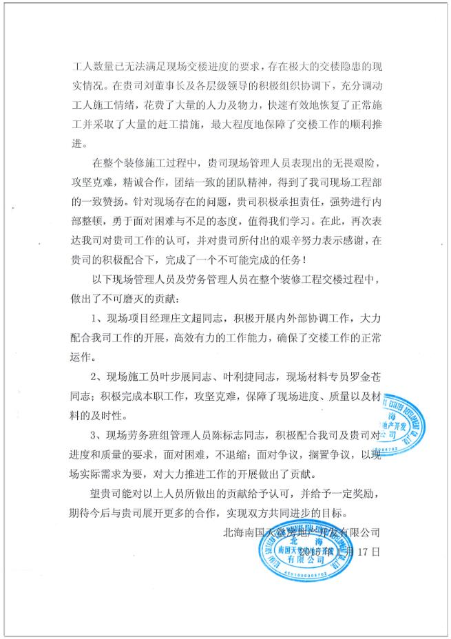关于北海恒大御景半岛首期11、12#楼室内精装修工程的表扬信