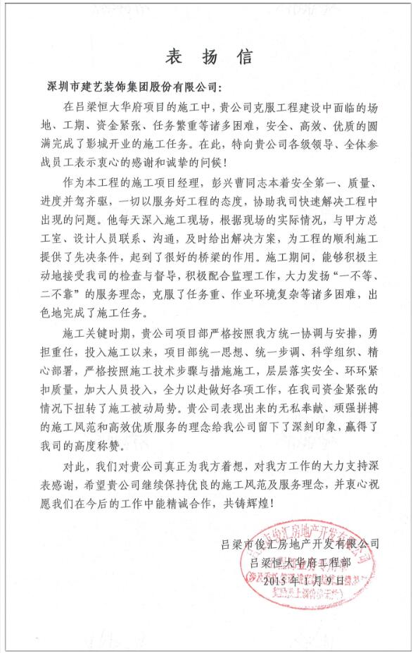 我司承建的山西吕梁恒大华府影剧院项目,在面临前期相关方进度严重滞后等严峻挑战时,项目部工程人员克服种种困难,不怕苦,不怕累,精心组织,科学安排,全力冲刺,全力配合,最终凭借努力付出,达到了业主方的进度目标要求,确保了影剧院准时开业。业主方对我司工程人员的高超管理水平以及对项目工作的高度负责任精神表示极大认同,对我司在该项目上所做出的巨大努力和突出表现表示了高度赞扬!