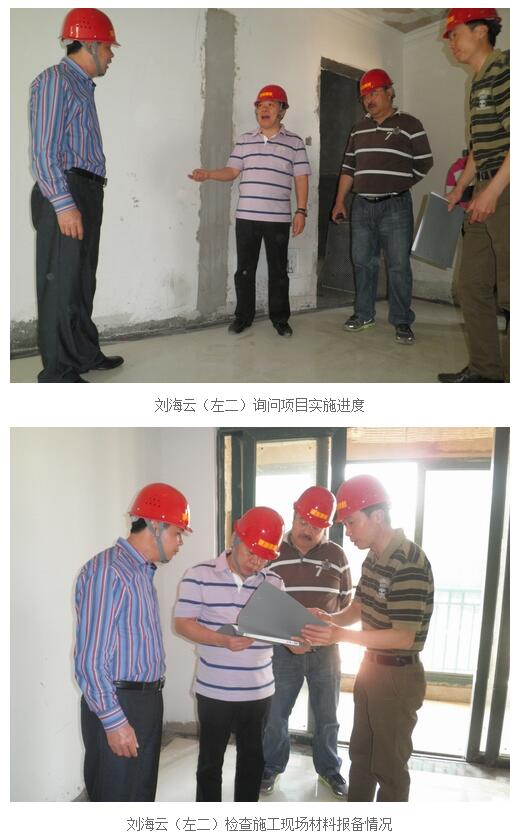 公司董事长刘海云于2013年5月12日亲临太原恒大山水城项目现场检查、指导工作,由集团工程总监杨广生(主管恒大项目)以及本项目部全体管理人员陪同,检查了现场内外施工作业区,认真听取了杨广生总监对于本项目的工作汇报,仔细向项目部负责人及各岗位负责或技术人员询问了施工的进度计划及实施情况、施工质量的措施及实施情况、人员的组织及安排情况、材料的计划及供应情况、甲方进度目标及质量目标要求、项目部为实现甲方的目标所采取的各项措施等等。刘海云董事长指出了项目施工管理上的各项不足,提出了各项宝贵的有针对性的措施和办法,并且要求项目部基于现有的管理水平要有一个较大的提升和飞跃,切实落实各项管理措施,必须采取一切可能的、合理的、可实施的措施确保甲方进度及质量目标,希望项目部着眼大局,攻坚克难,科学管理,顺利完成各项既定的任务目标,赢得甲方的赞誉和良好评价。