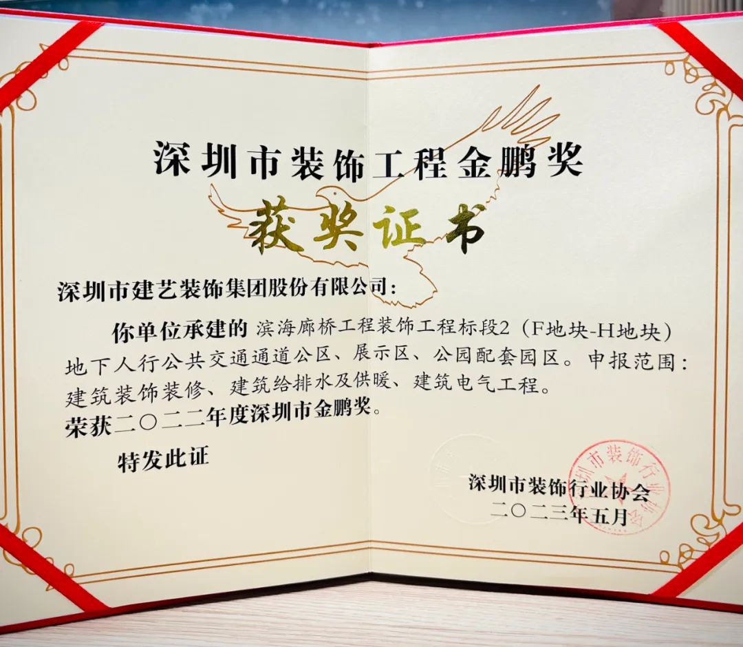 近日,由深圳市装饰行业协会主办的深圳市装饰工程金鹏奖评审结果通知,建艺集团承建的滨海廊桥装饰工程标段2(F地块-H地块)工程荣获“2022 年度深圳市金鹏奖”。