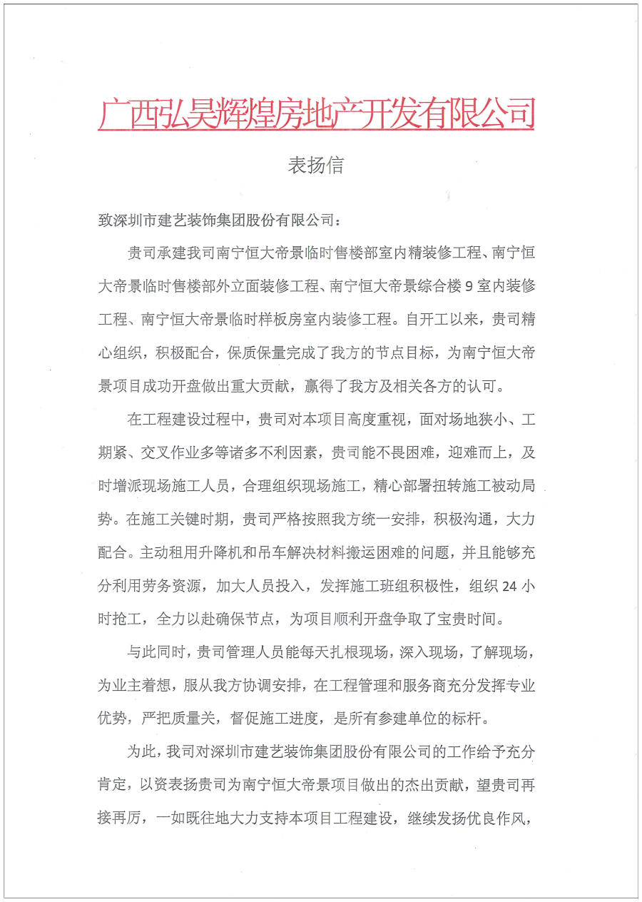 建艺集团南宁恒大帝景项目部受表彰